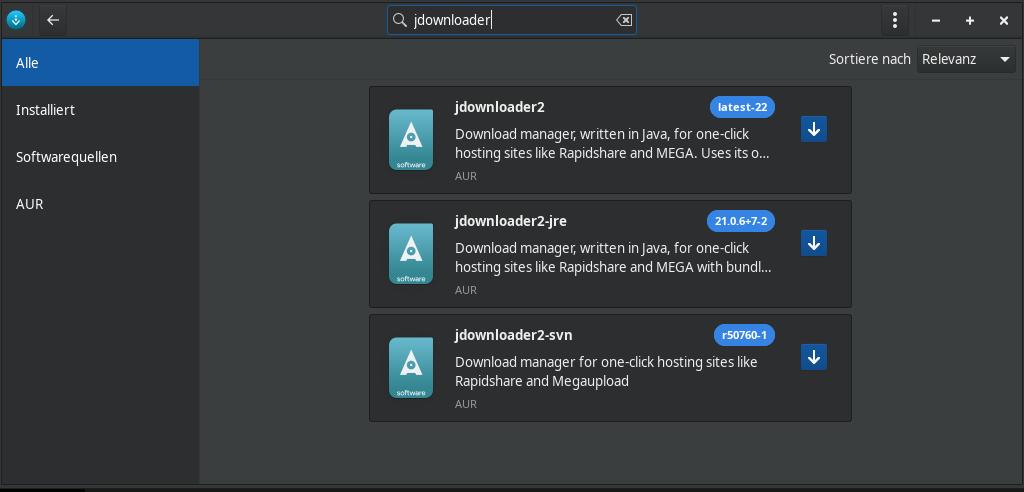 Als ich gerade Jdownloader ins Suchfeld getippt habe, kamen tatsächlich Ergebnisse für / mit Jdownloader 2.