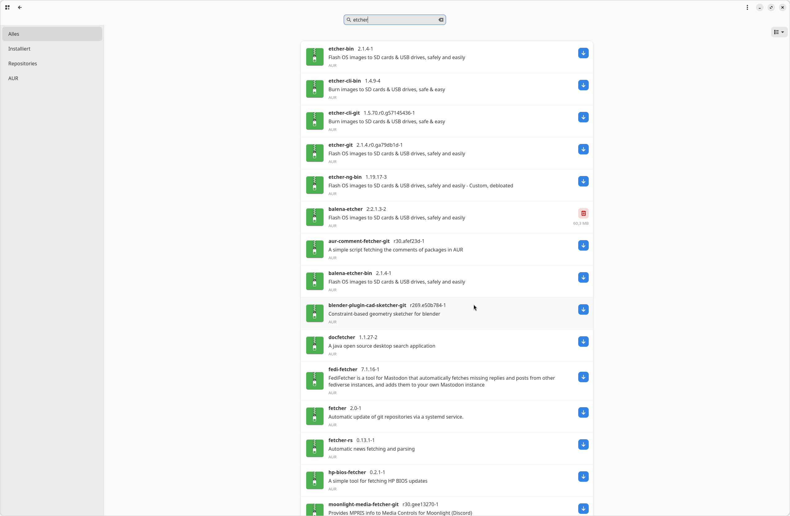 Der Jdownloader findet sich nicht mehr in AUR, die (gnome) Systemüberwachung ist ebenfalls verschwunden, und bei (gnome) Laufwerke ist ein Fehler. Mit dem (RICHTIGEN) Suchbegriff Laufwerke findet sich nichts, erst wenn man das letzte e weglässt / löscht, dann findet sich Laufwerke (mit e !)…