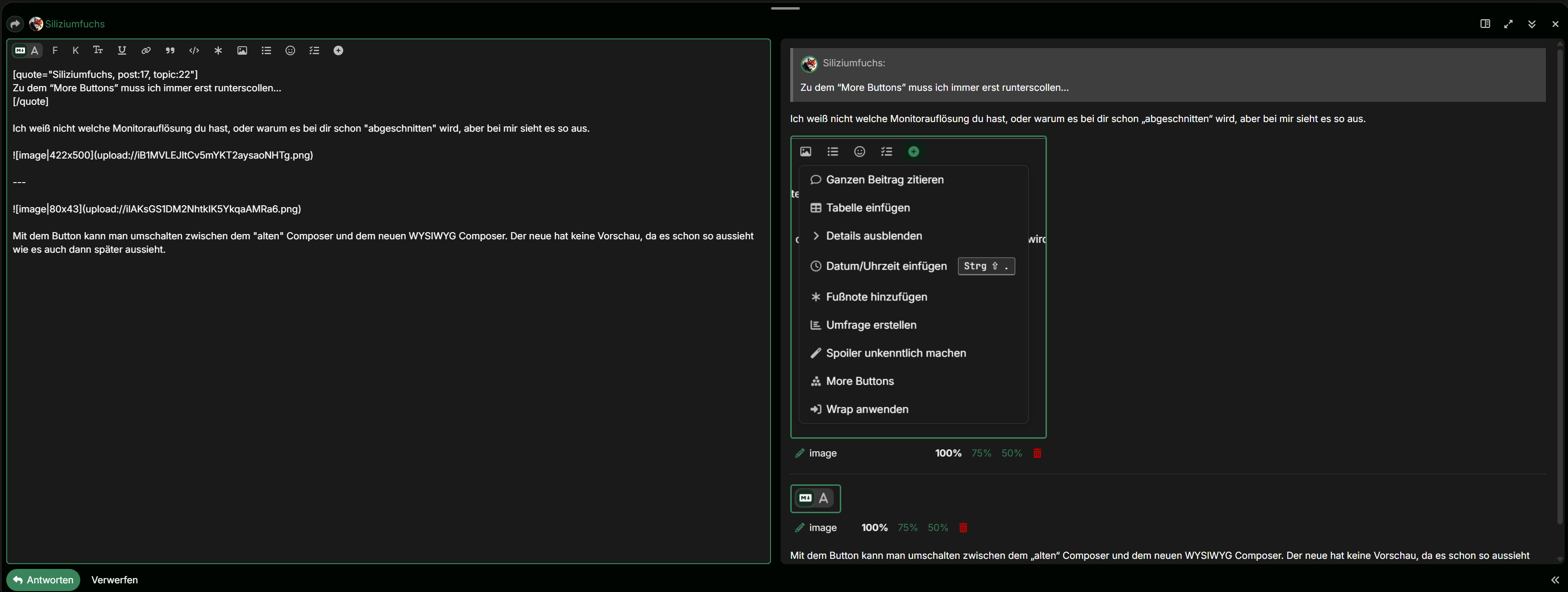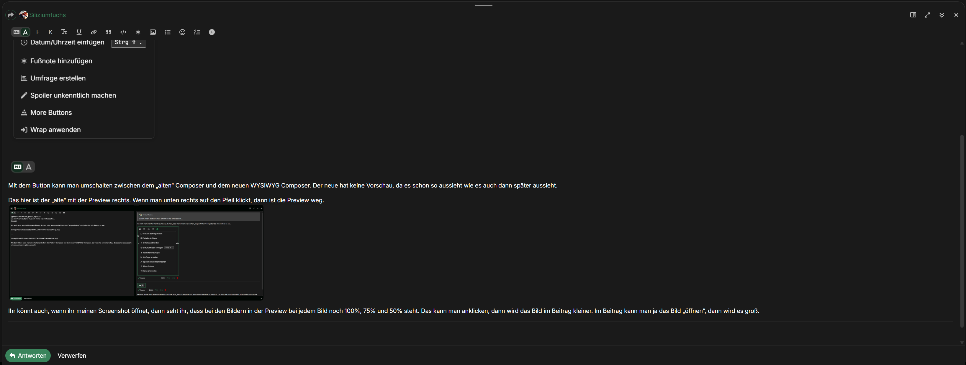 Mit dem Button kann man umschalten zwischen dem „alten“ Composer und dem neuen WYSIWYG Composer. Der neue hat keine Vorschau, da es schon so aussieht wie es auch dann später aussieht.