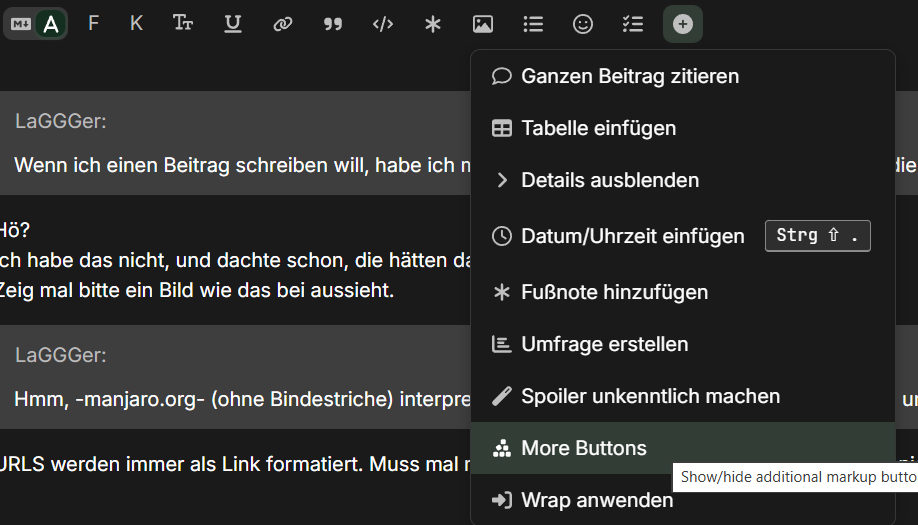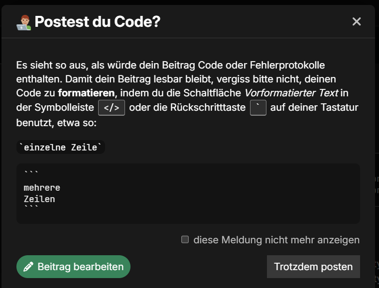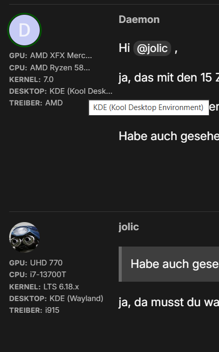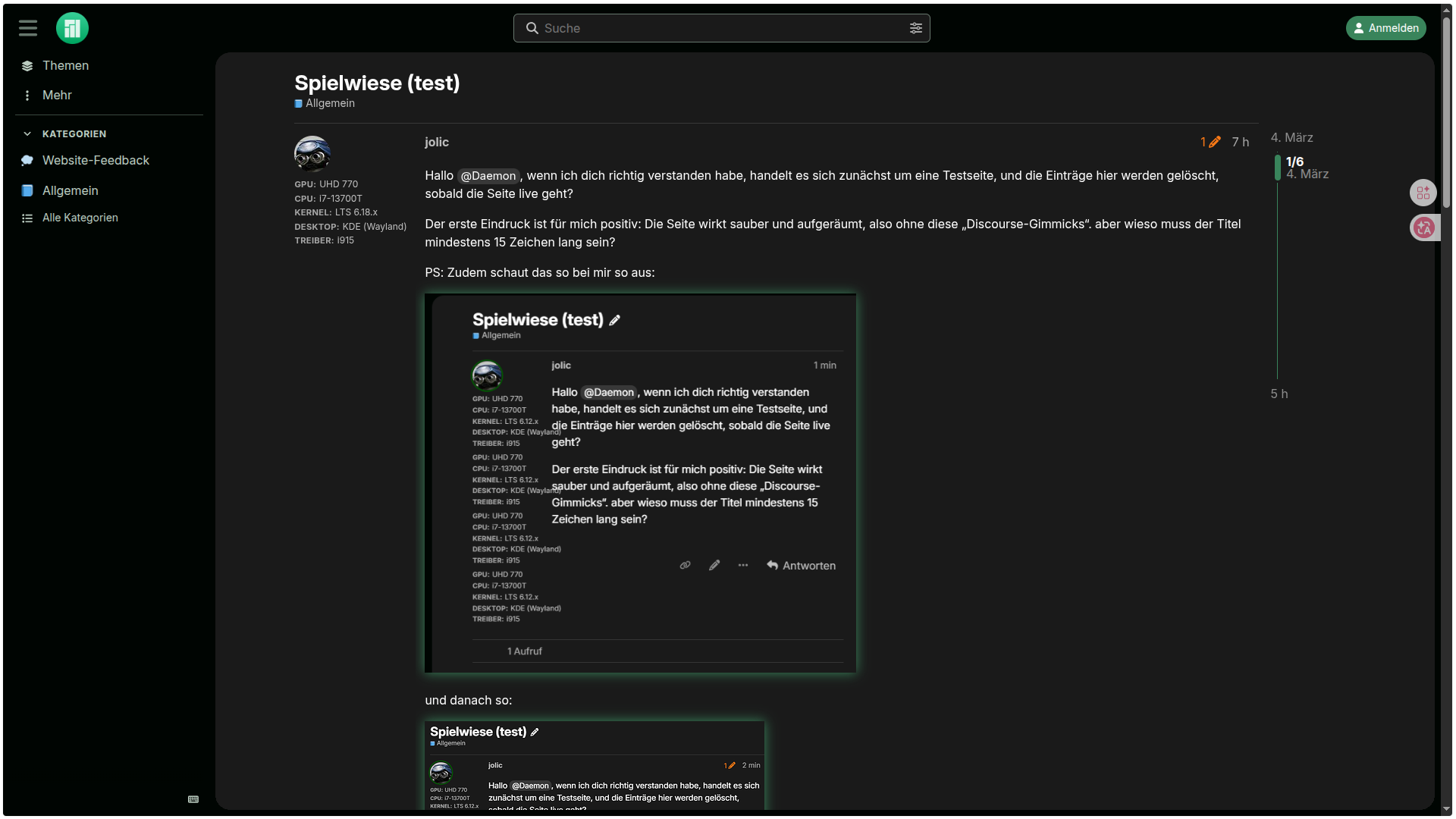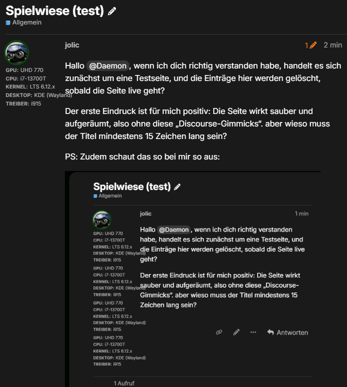 Mit der Breite des Beitrags bin ich zufrieden, wusste gar nicht das das geht, sehr gut. Ich kenne halt nur das EndeavourOS & Manjaro.org Forum mit Discurse, die sind beide gleich und, wie ich schon schrieb, viel zu schmal.