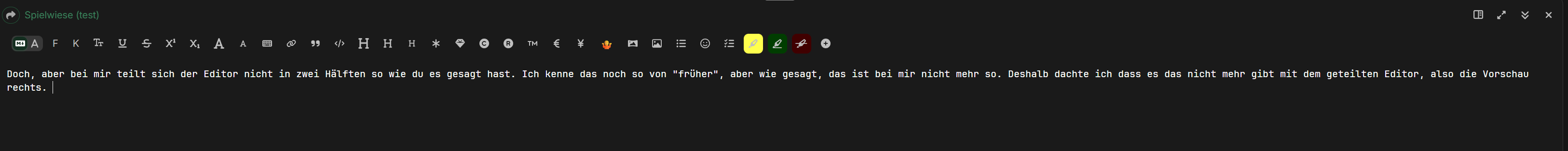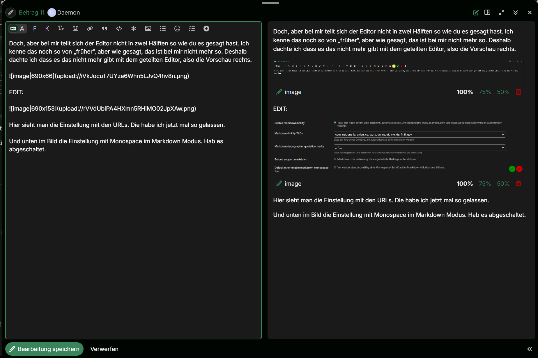 Wenn ich einen Beitrag schreiben will, habe ich mit dem A - Zeichen oben in der Formatleiste die Möglichkeit zur zwei/ein Fenster Ansicht. Links ist wohl der Entwurfsmodus, rechts der fertige Beitrag wie er real nach dem posten aussehen würde.