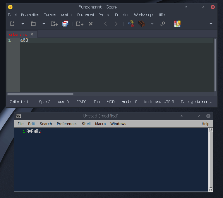 Anbei ein Screenshot (oben GEANY mit korrekter Anzeige und unten NEDIT mit komischen Symbolen)