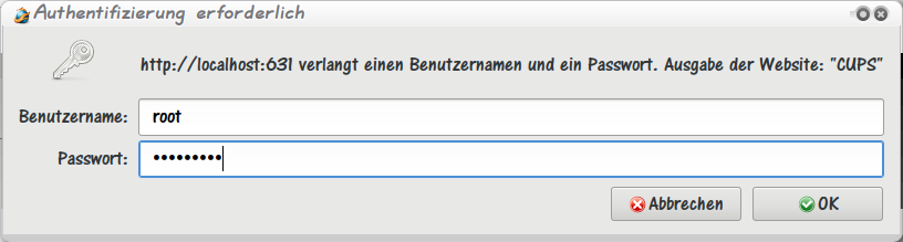 Wenn ich cups aufrufe, Verwaltung/Administration > Füge Drucker hinzu/Add Printer klicke, kommt ein Fenster (siehe Anhang), in dem ich als Behutzername root und als Passwort das Administratorpasswort eingebe. dann funktioniert es jedenfalls bei mir.